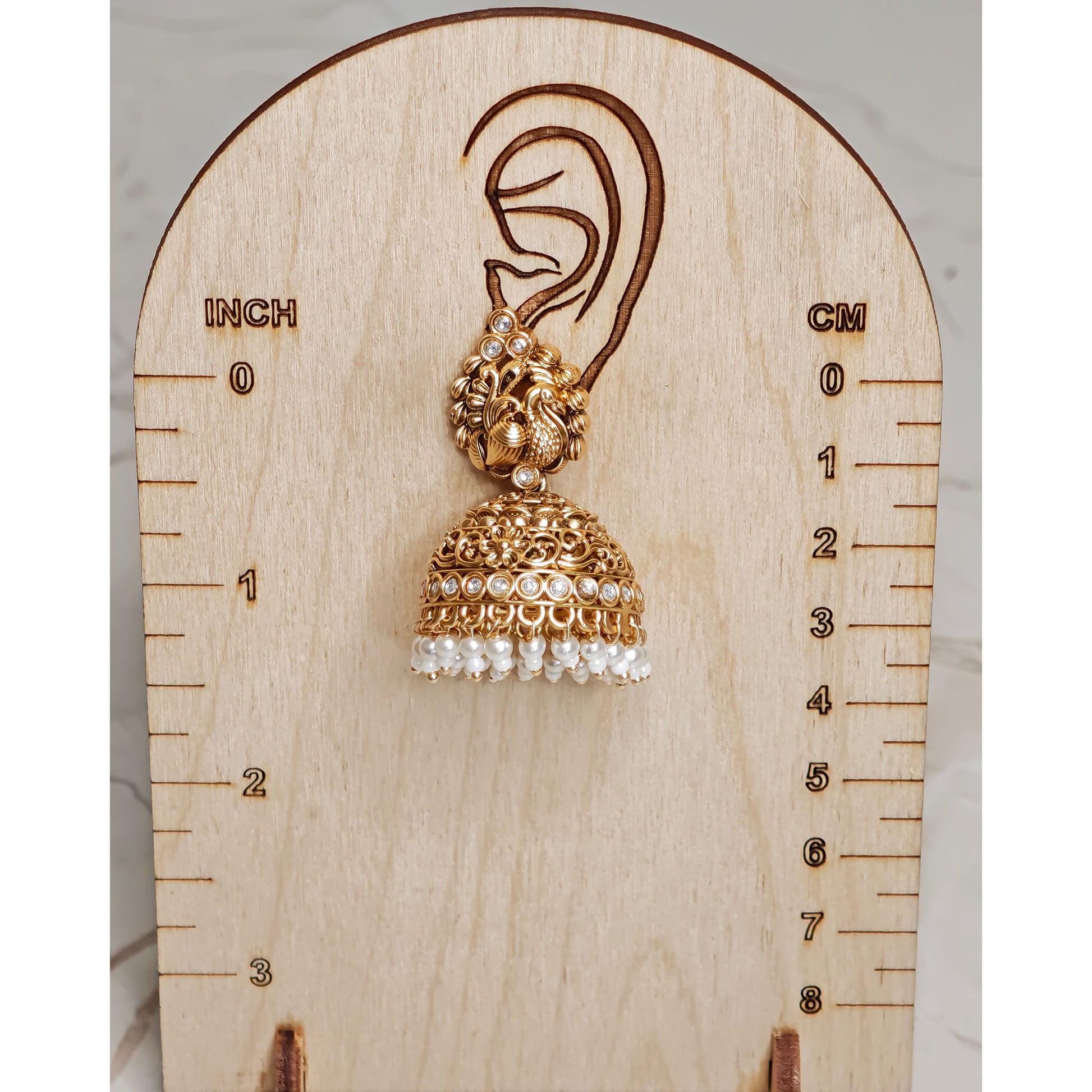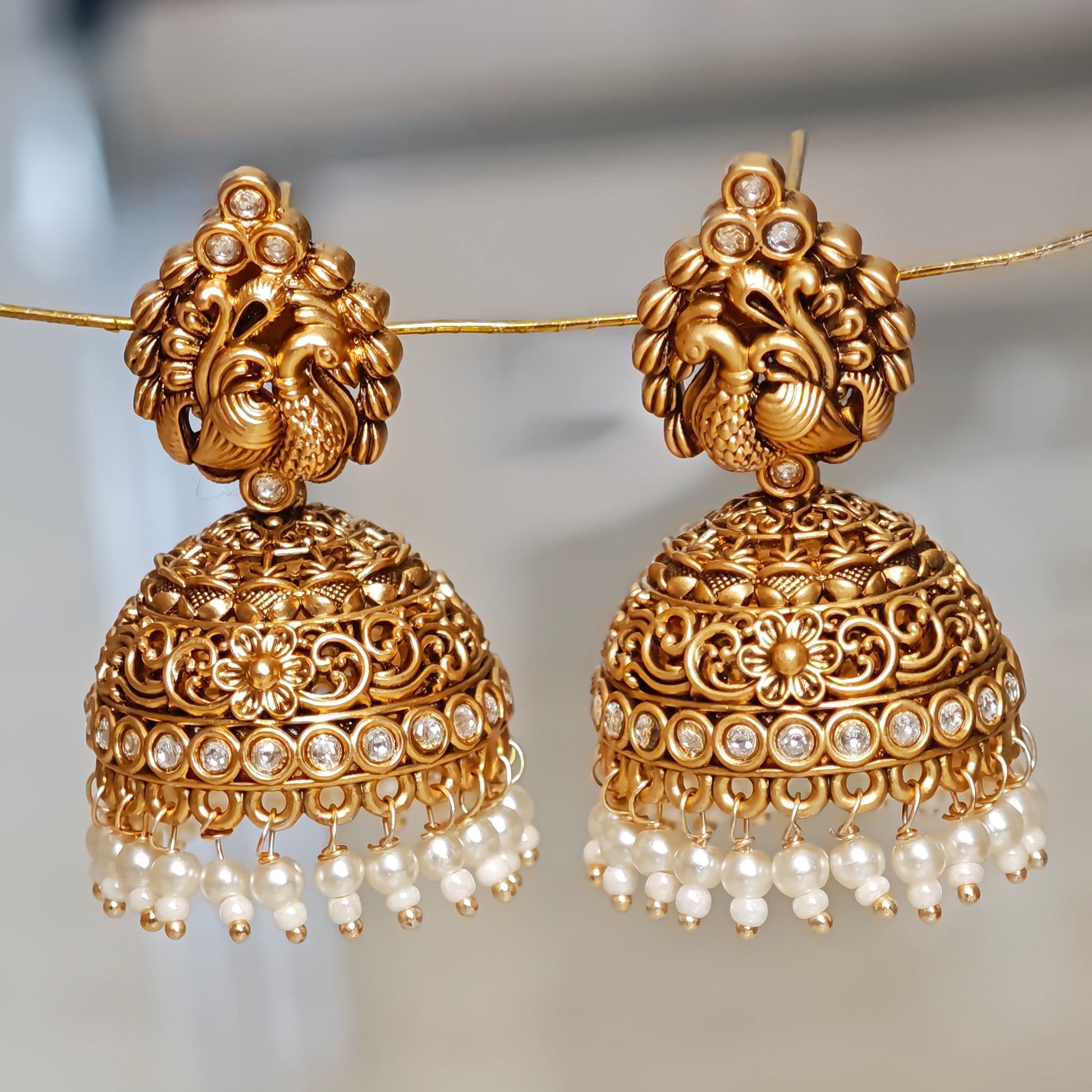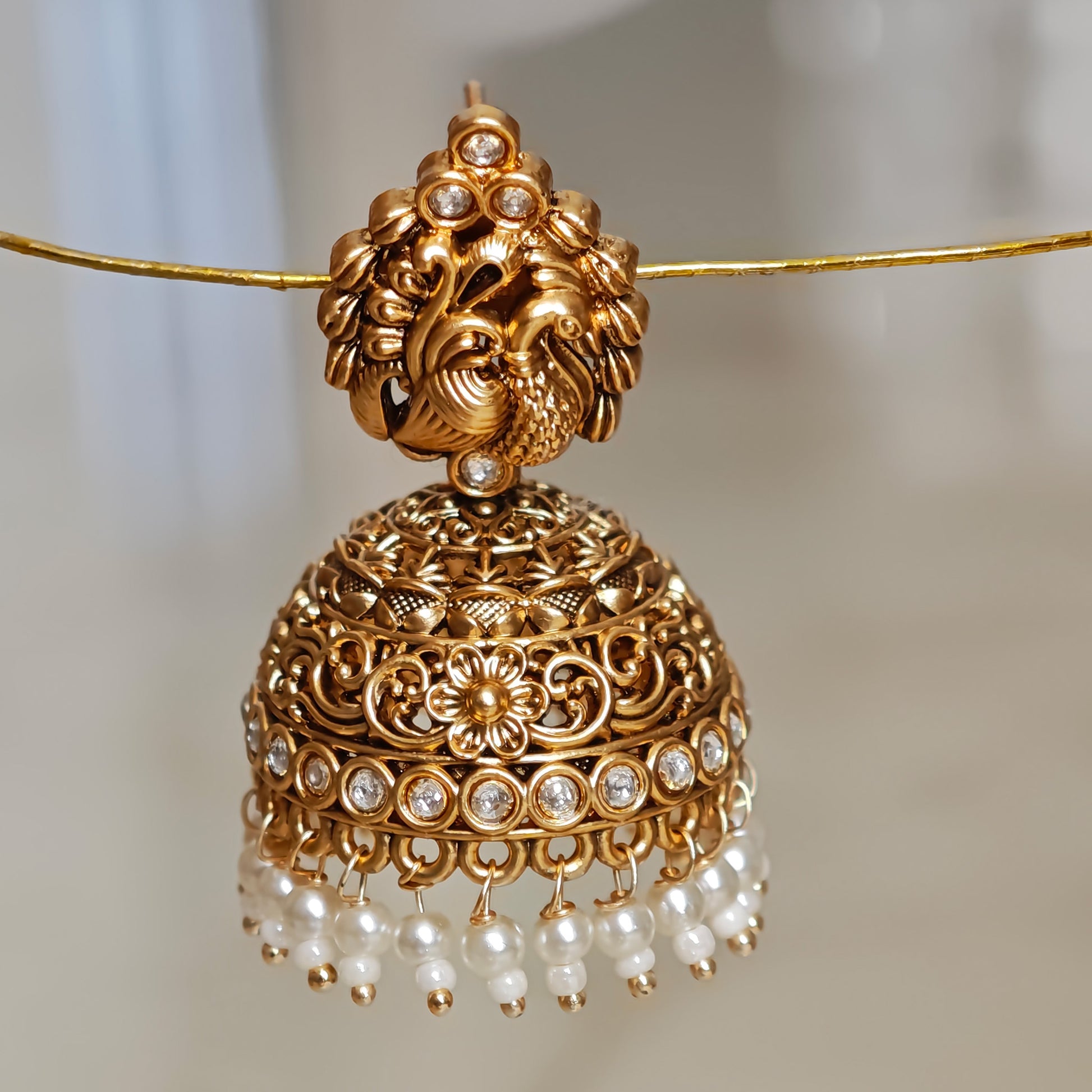 Elevate your style with the Peacock Antique Jhumki, featuring a sophisticated blend of golden tones and lustrous pearls for a timeless, elegant look.
