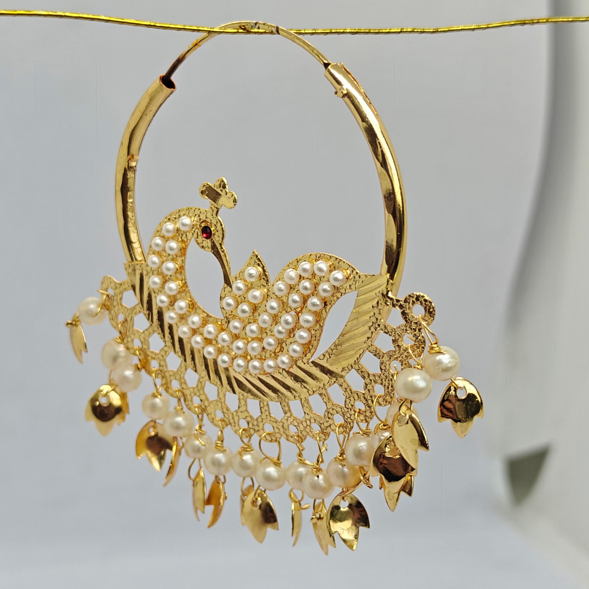 Elevate your style with the Golden Peacock Pearl Hoops, featuring a sophisticated blend of golden tones and lustrous pearls for a timeless, elegant look.