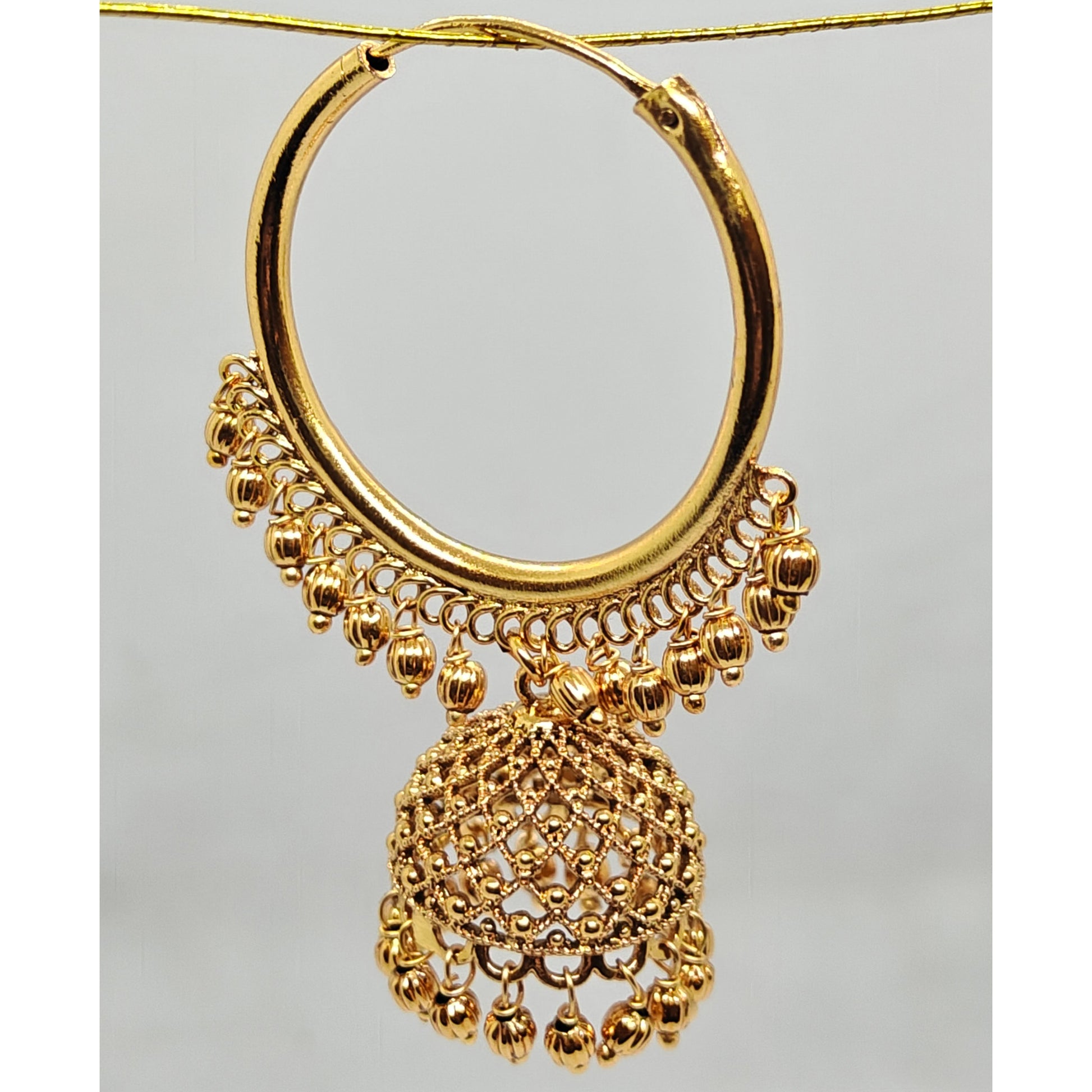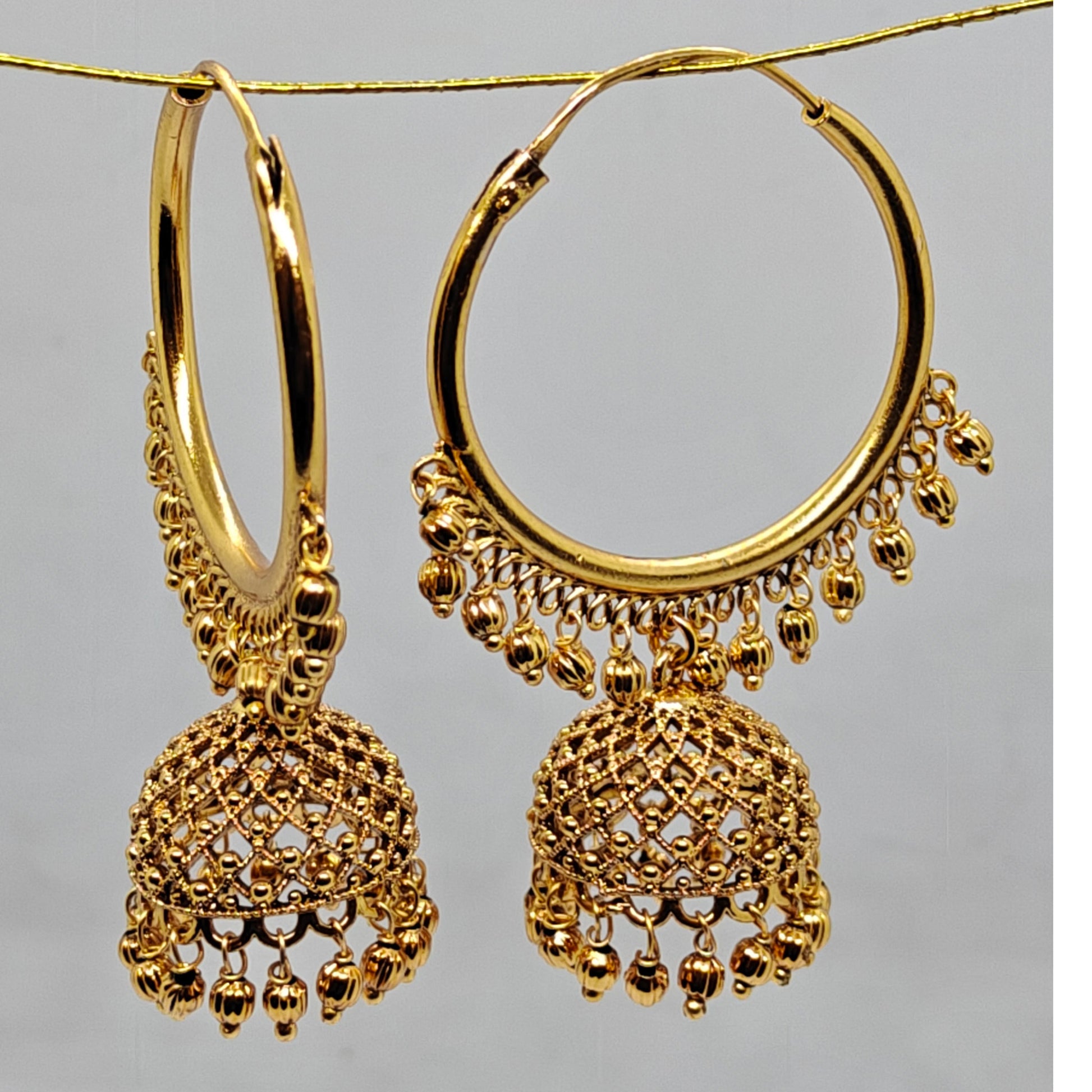 Elegant and expertly crafted, the Golden Jaali Hoop Jhumki offers a timeless fusion of traditional lattice design with modern hoop style for a sophisticated accessory.