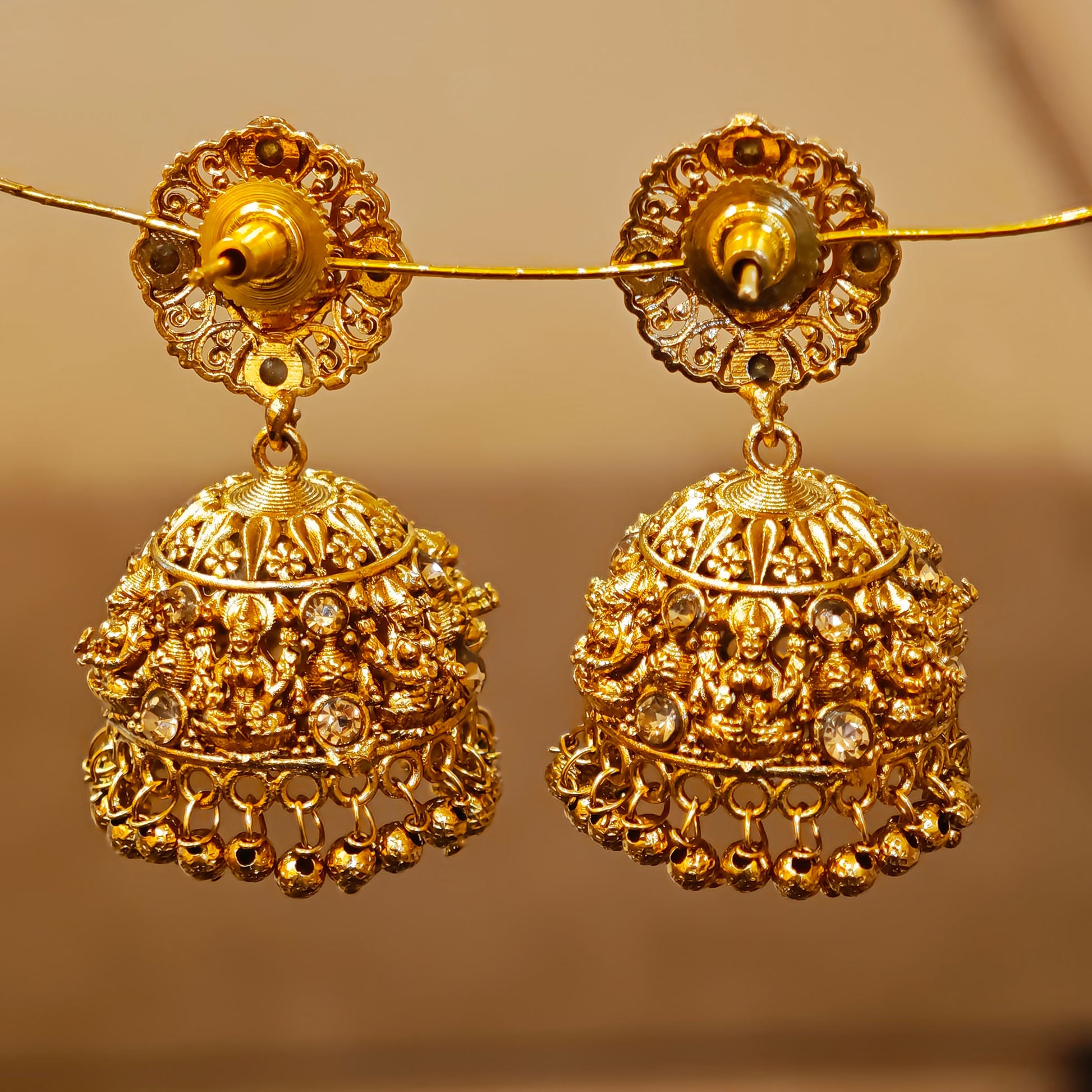 Exquisitely crafted, the Rich Design Temple Jhumki showcases intricate traditional artistry, perfect for elevating any ethnic ensemble with timeless elegance.