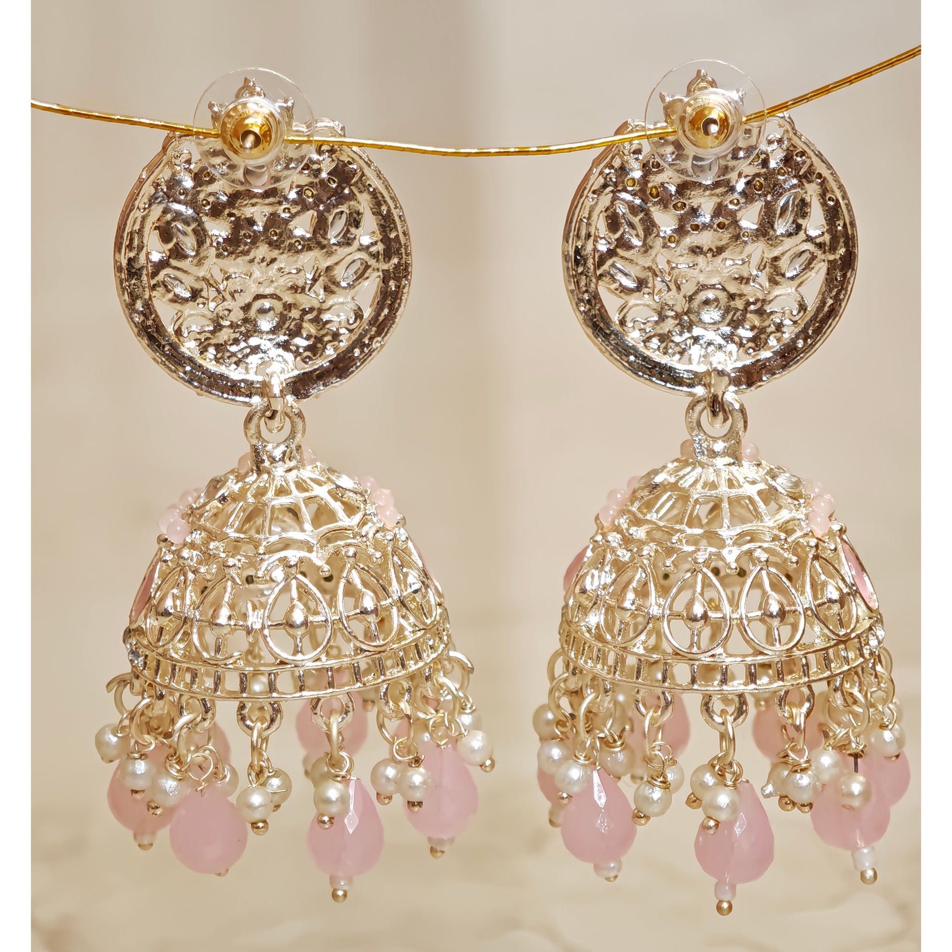 Delicate Baby Pink Kundan-Styled Stone Jhumkis set in refined silver-toned metalwork, showcasing intricate traditional craftsmanship with a soft, feminine aesthetic ideal for weddings and festive occasions.