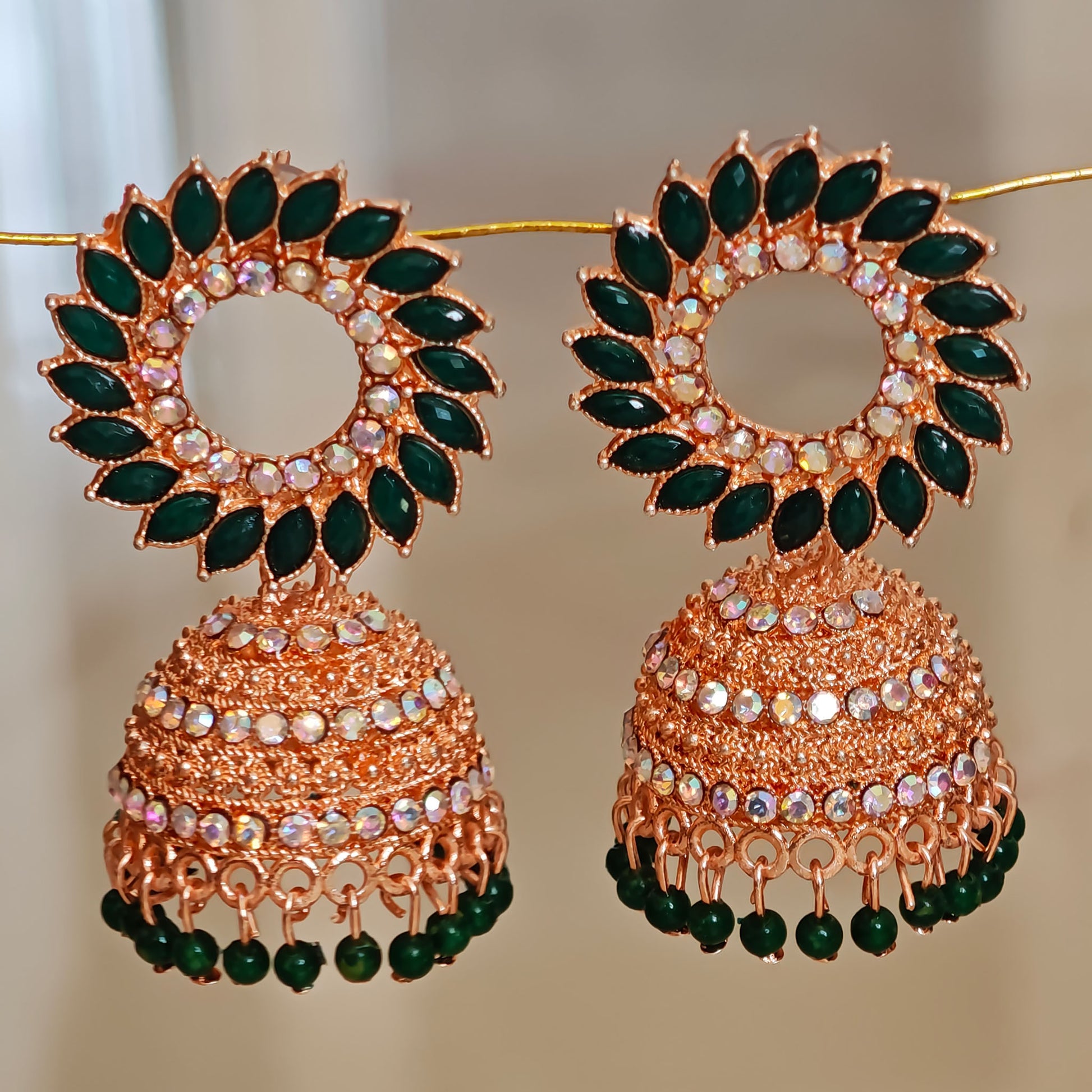 Stunning Bottle Green Floral Golden Jhumki adorned with intricate floral patterns and golden accents, perfect for adding sophisticated elegance to traditional and contemporary ensembles.