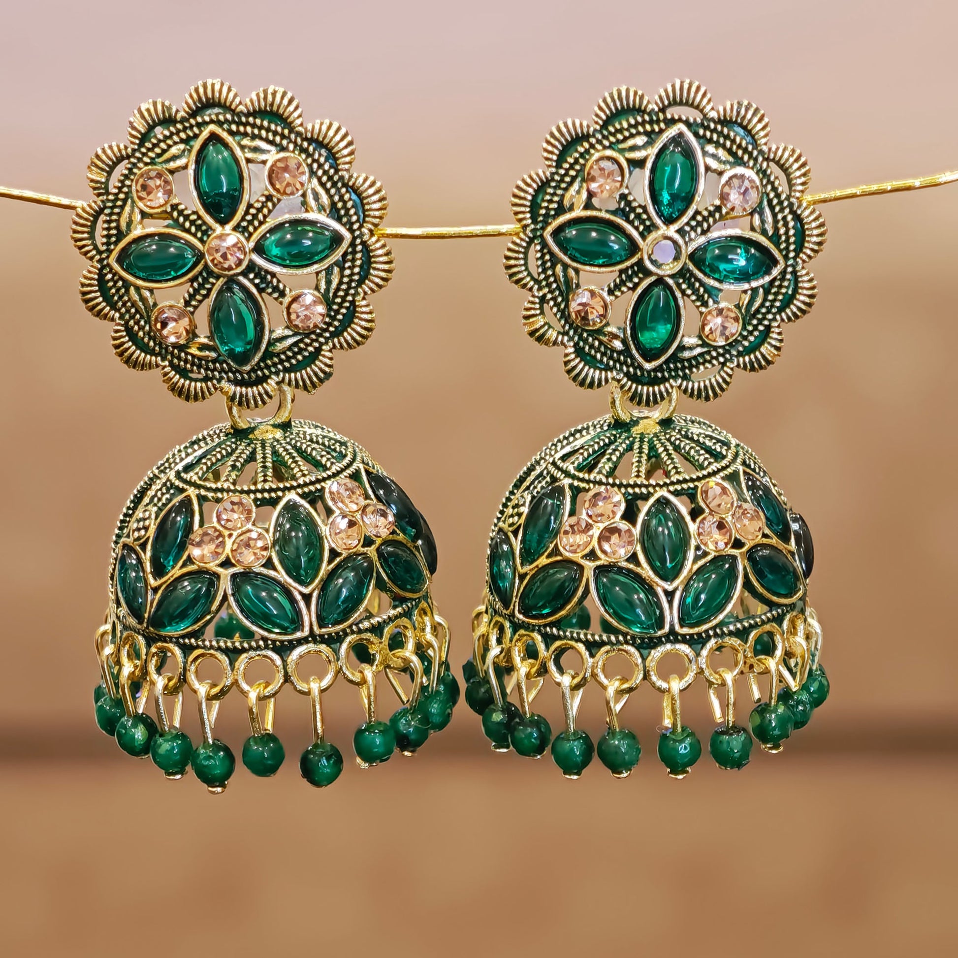 Captivating Bottle Green Floral Jaali Jhumkis featuring intricate lattice work interwoven with delicate botanical designs, offering a refined accessory that beautifully balances traditional craftsmanship with contemporary aesthetic appeal.