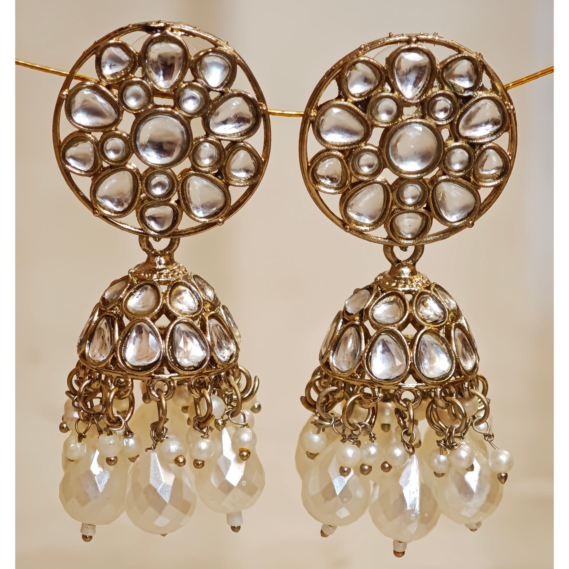 Radiant Golden Kundan Jhumkis combining traditional Indian craftsmanship with brilliantly faceted stones and warm metallic tones, delivering timeless sophistication for festive and formal occasions.