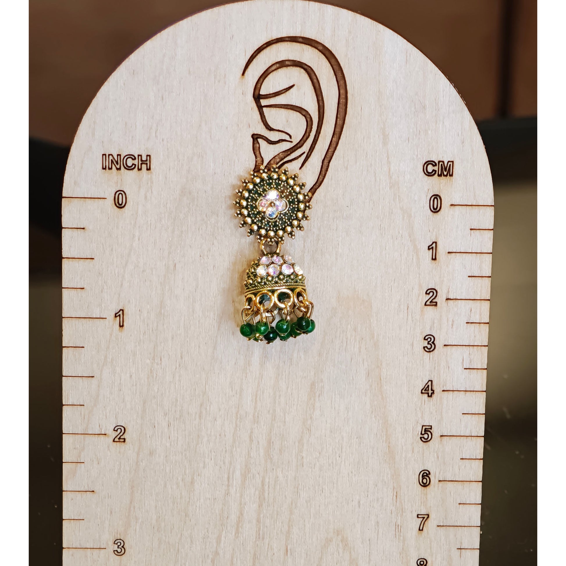 Charming Green Jhumkis with rounded tops in a petite silhouette, delivering a soft, feminine aesthetic perfect for adding delicate color and graceful movement to your accessory wardrobe.