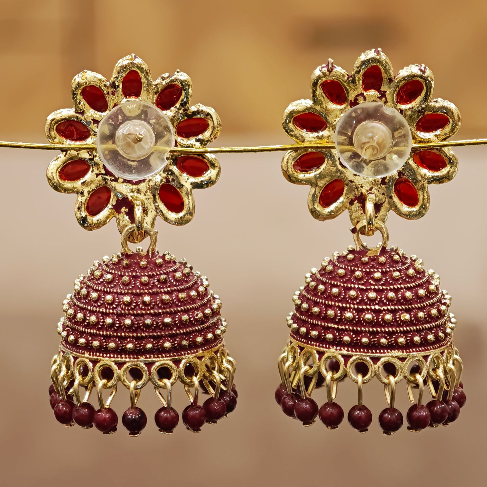 Radiant Maroon Floral Top Dome Jhumki showcasing delicate botanical embellishments that exude regal sophistication, perfect for elevating your traditional ensemble with vibrant color and exquisite craftsmanship.