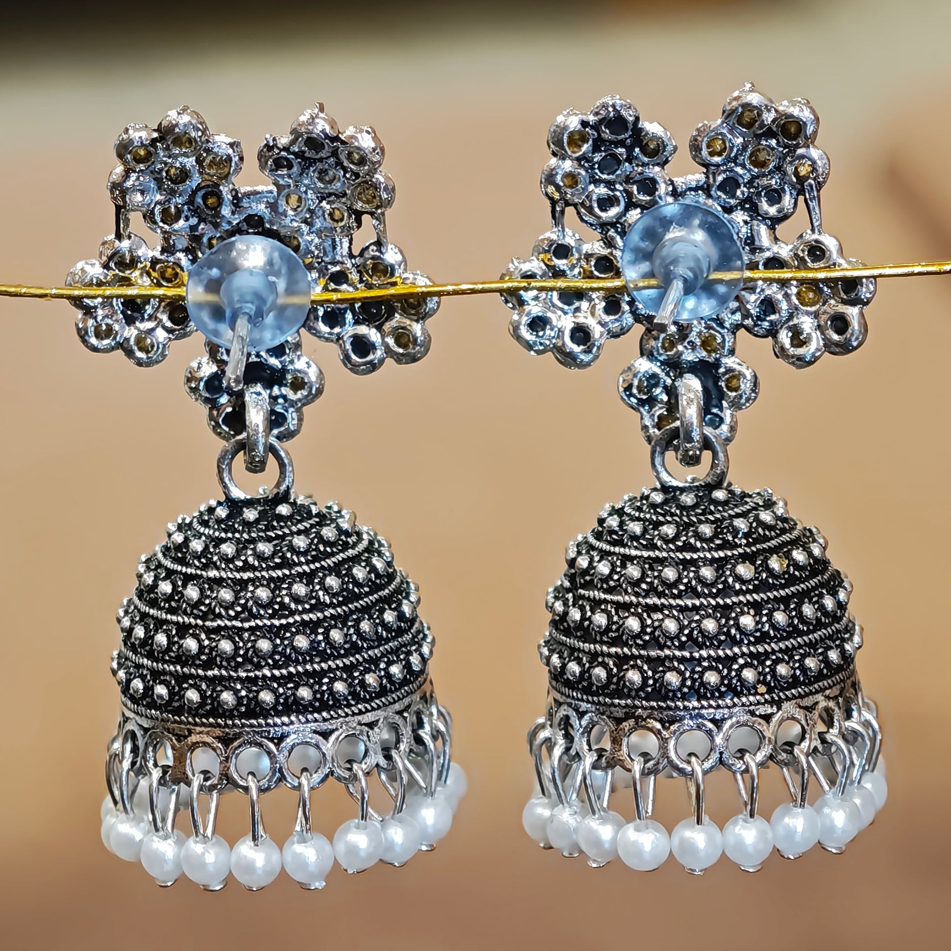 Stone Stud Dome Jhumki - Refined traditional earrings featuring a domed silhouette embellished with stone studs, combining textural interest with classic bell-shaped design for versatile ethnic wear and celebratory occasions.