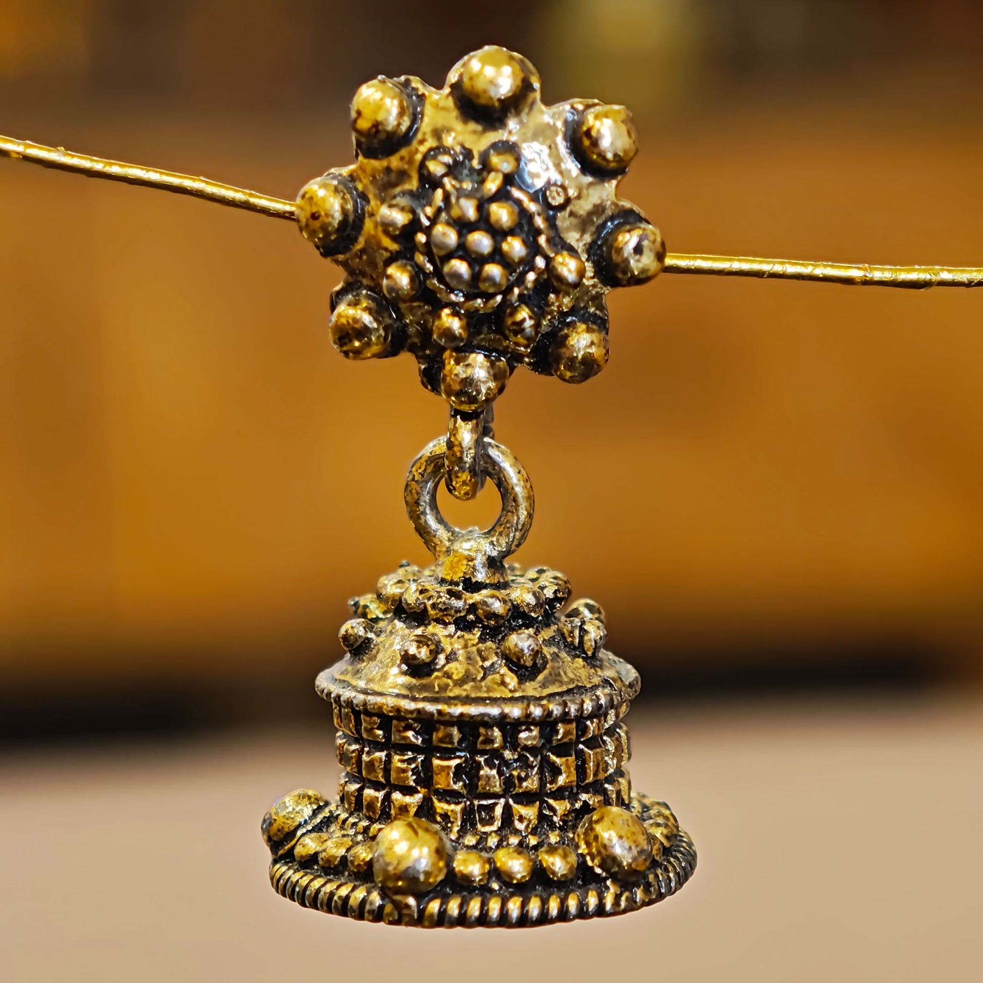 Compact Antique Golden Jhumkis with a rich, vintage patina that brings timeless elegance and classical sophistication to any jewelry collection or festive ensemble.