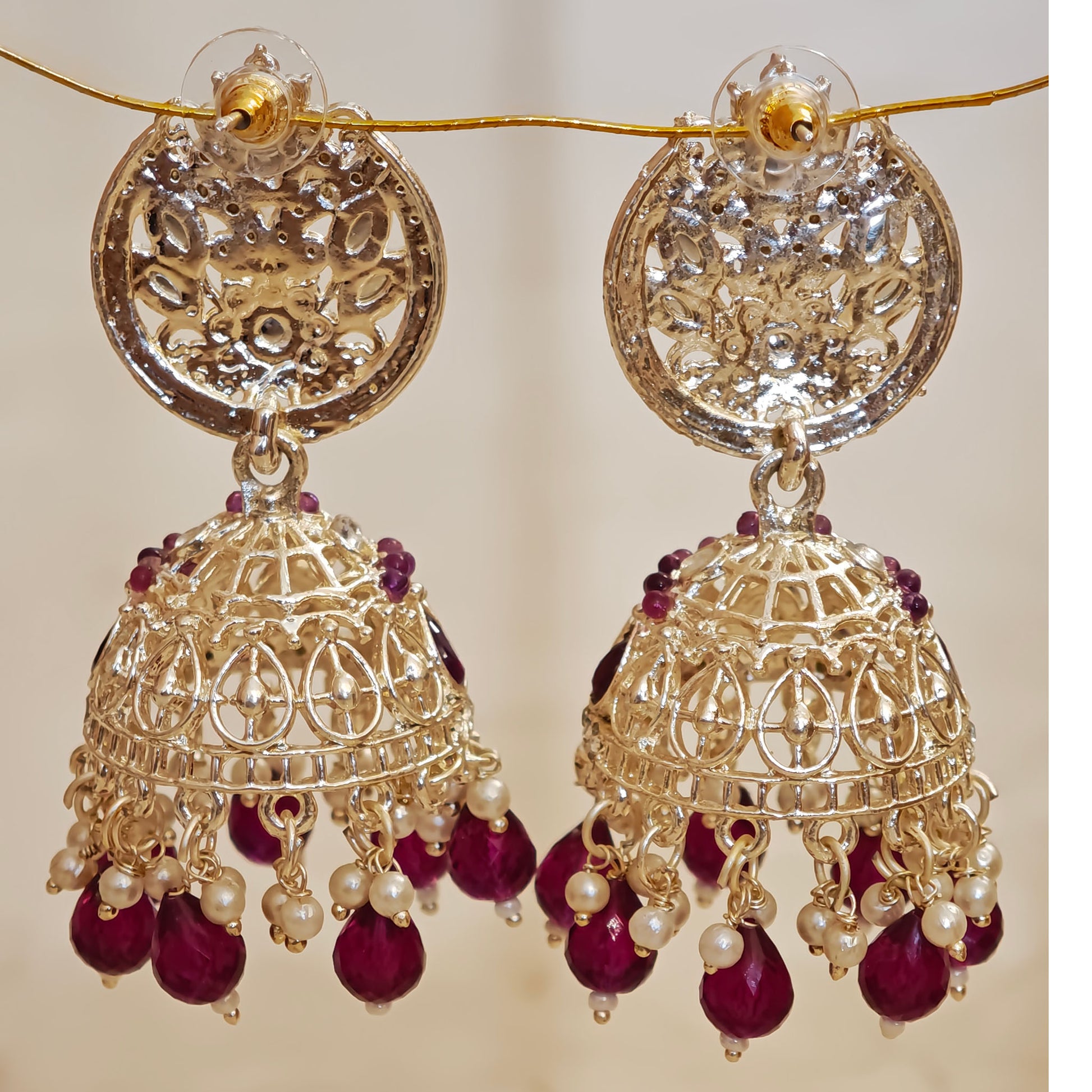 Striking Magenta Kundan-Styled Stone Jhumki set in lustrous silver, showcasing meticulous gemstone detailing that captures light beautifully while delivering authentic ethnic elegance for discerning jewelry enthusiasts.