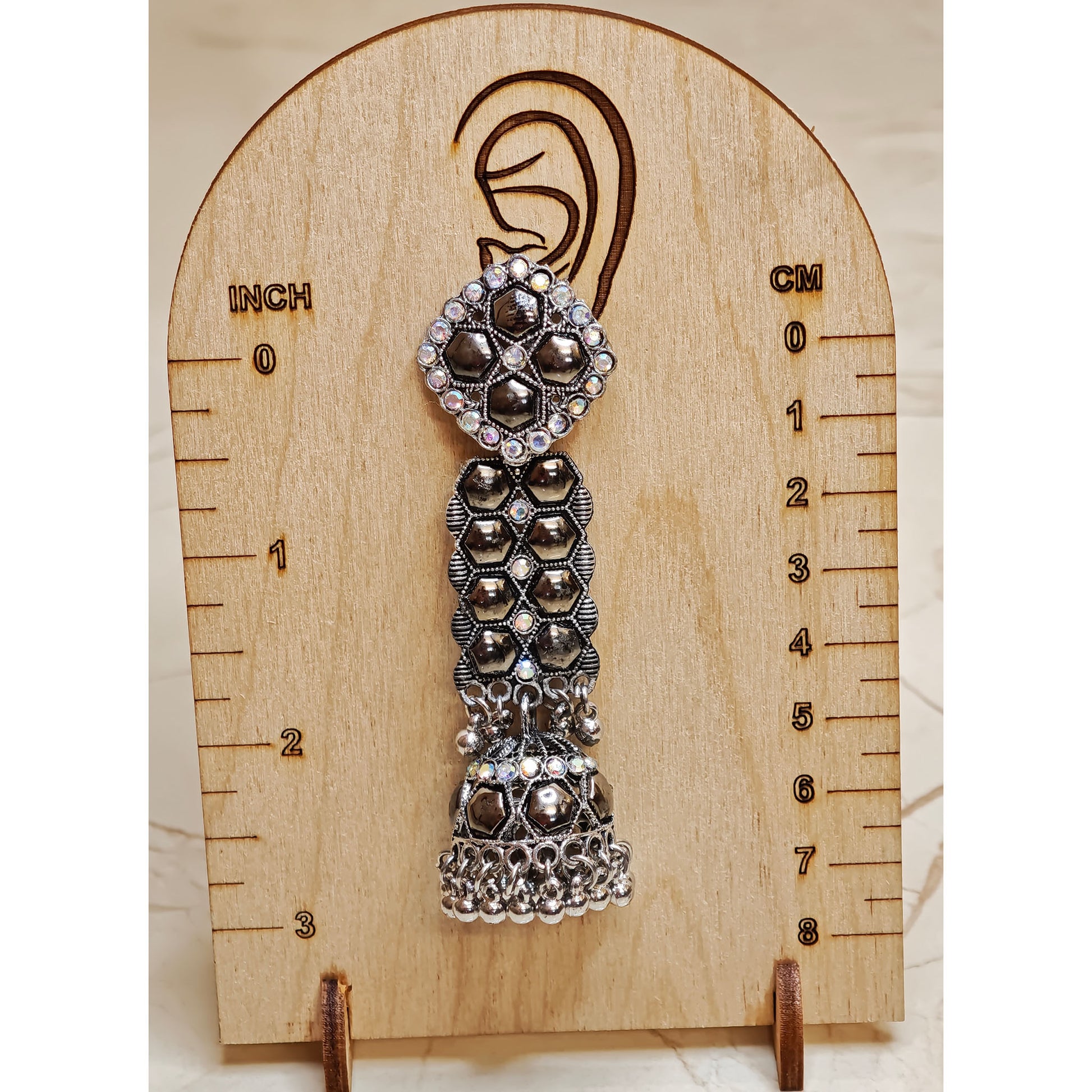 Striking Oxidized Long Stone Jhumkis featuring traditional bell-shaped design with semi-precious stone embellishments, delivering timeless ethnic elegance with contemporary appeal.