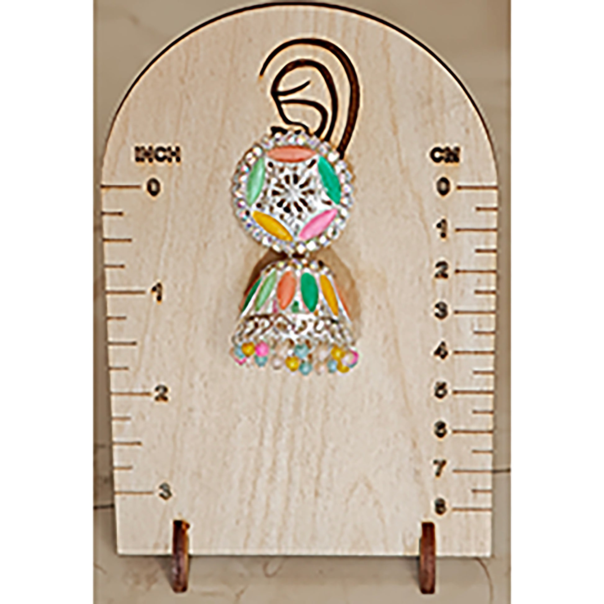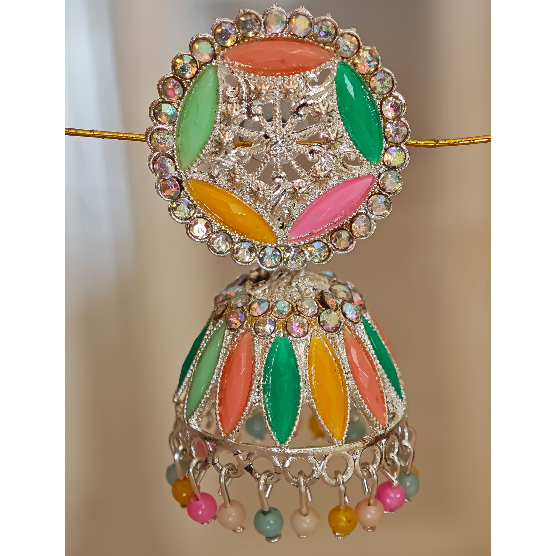 Delicate Pastel-hued Jhumki with silver-toned metalwork, offering a contemporary take on traditional jewelry that effortlessly complements both modern and ethnic aesthetics.