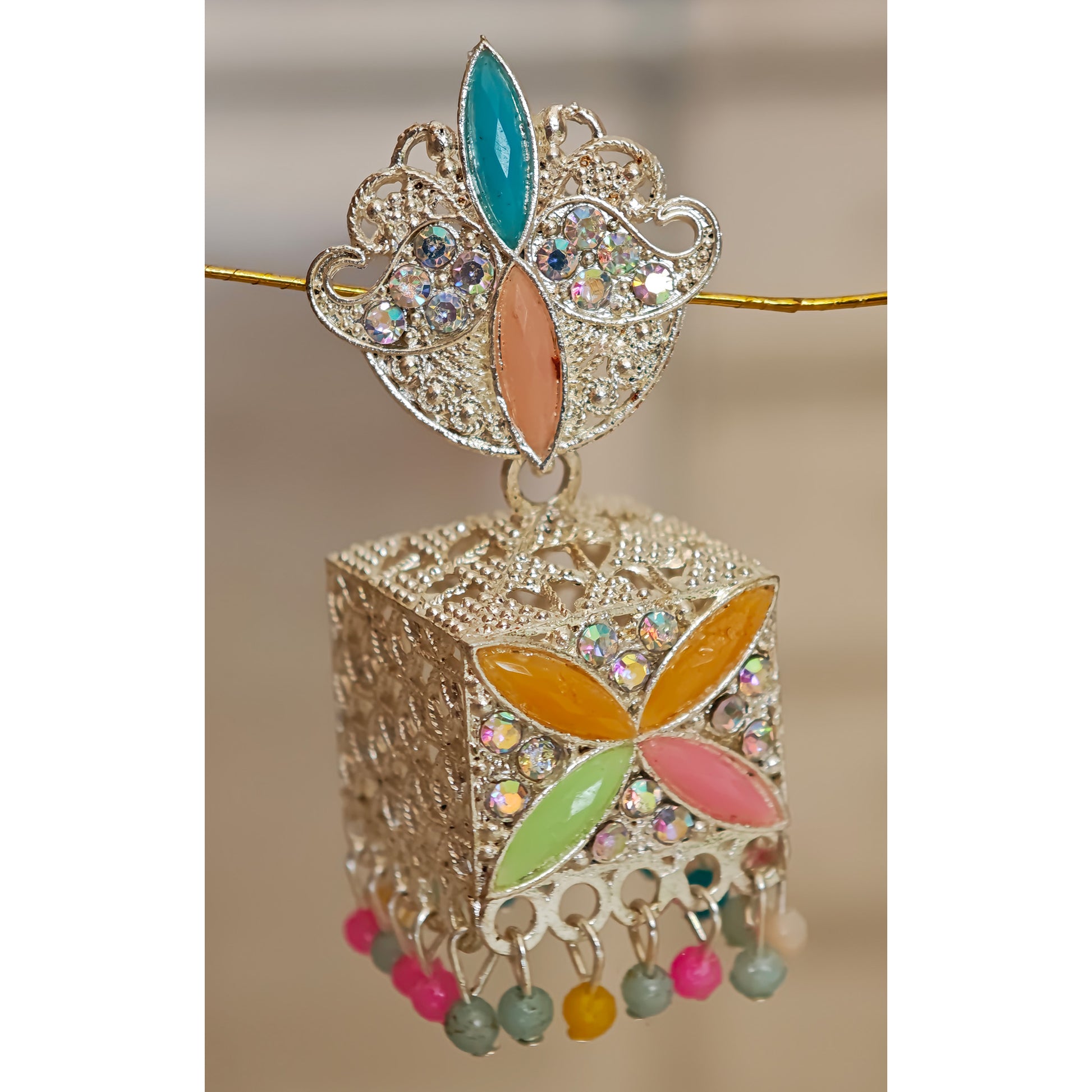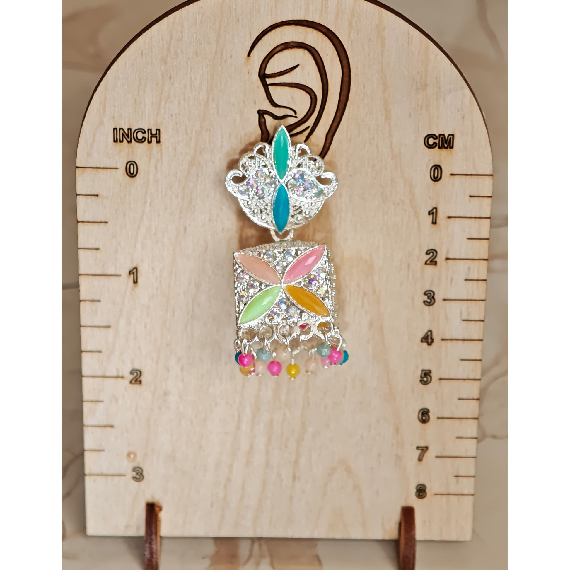 Sophisticated Square-Shaped Jhumki in soft pastel tones with silver-toned detailing, delivering a modern geometric silhouette that elevates traditional styling with contemporary flair.