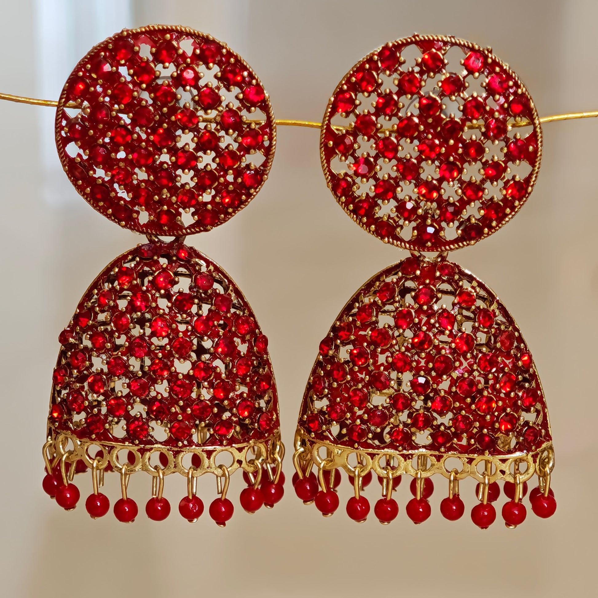 Bold Flat-Domed Jhumki adorned with vibrant red stones, combining architectural elegance with rich color to create a striking accessory for festive celebrations and special occasions.