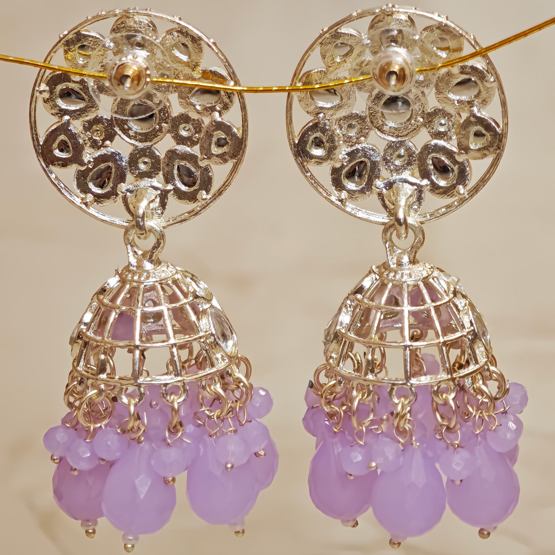 Sophisticated Lavender Kundan Jhumkis showcasing refined artisanal detailing with ornate metalwork, ideal for elevating your traditional jewelry collection with understated luxury.