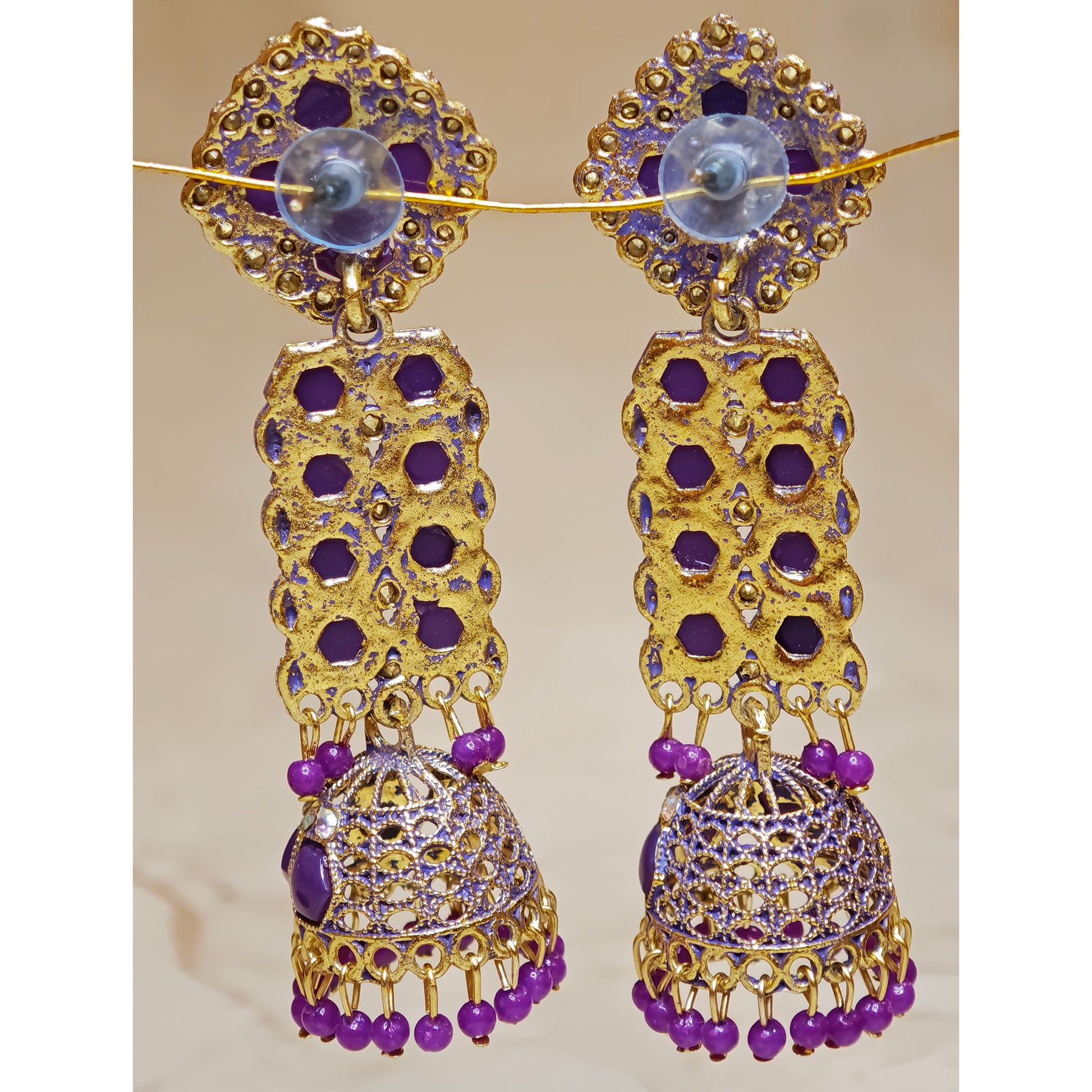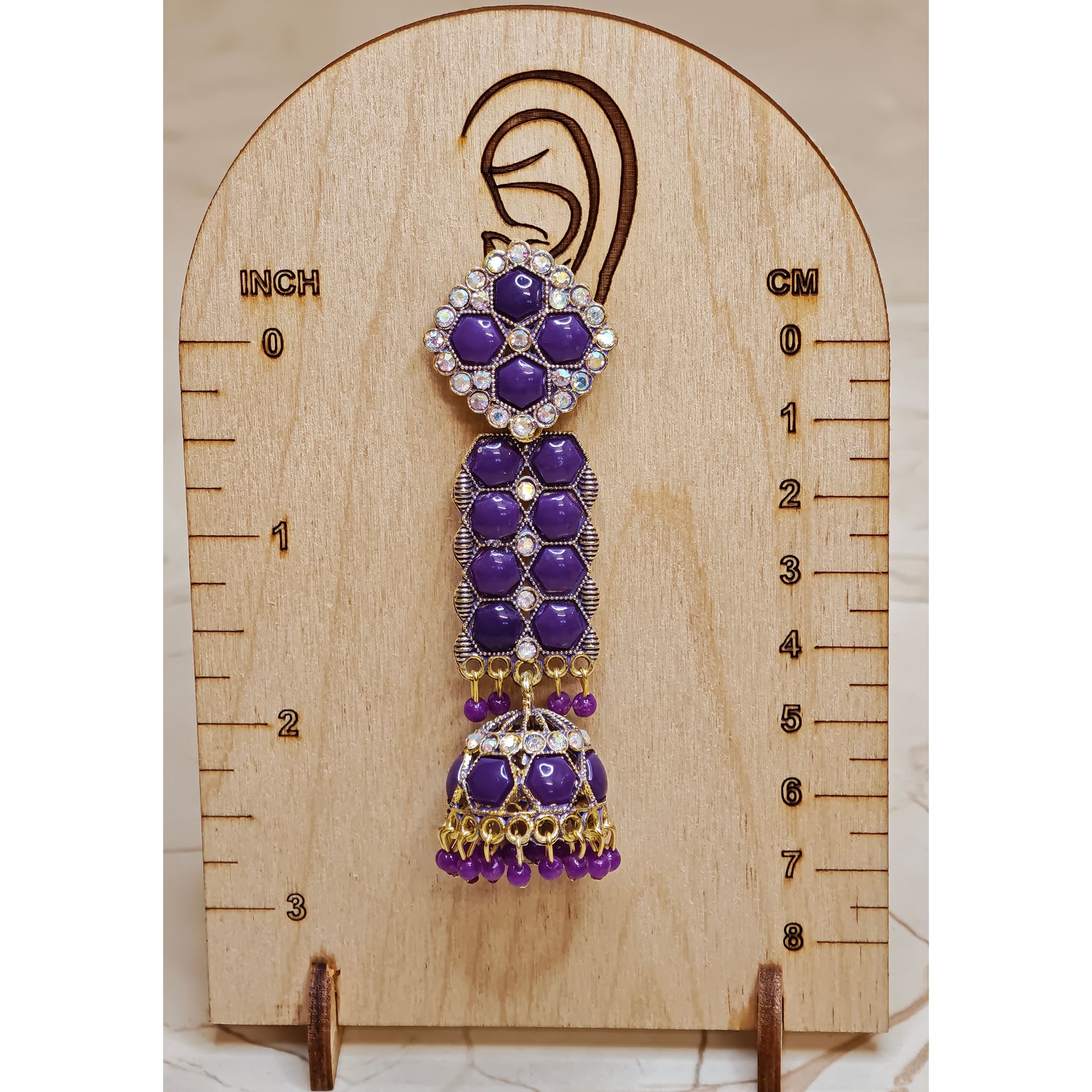 Striking Long Stone Jhumkis featuring traditional bell-shaped design with semi-precious stone embellishments, delivering timeless ethnic elegance with contemporary appeal.