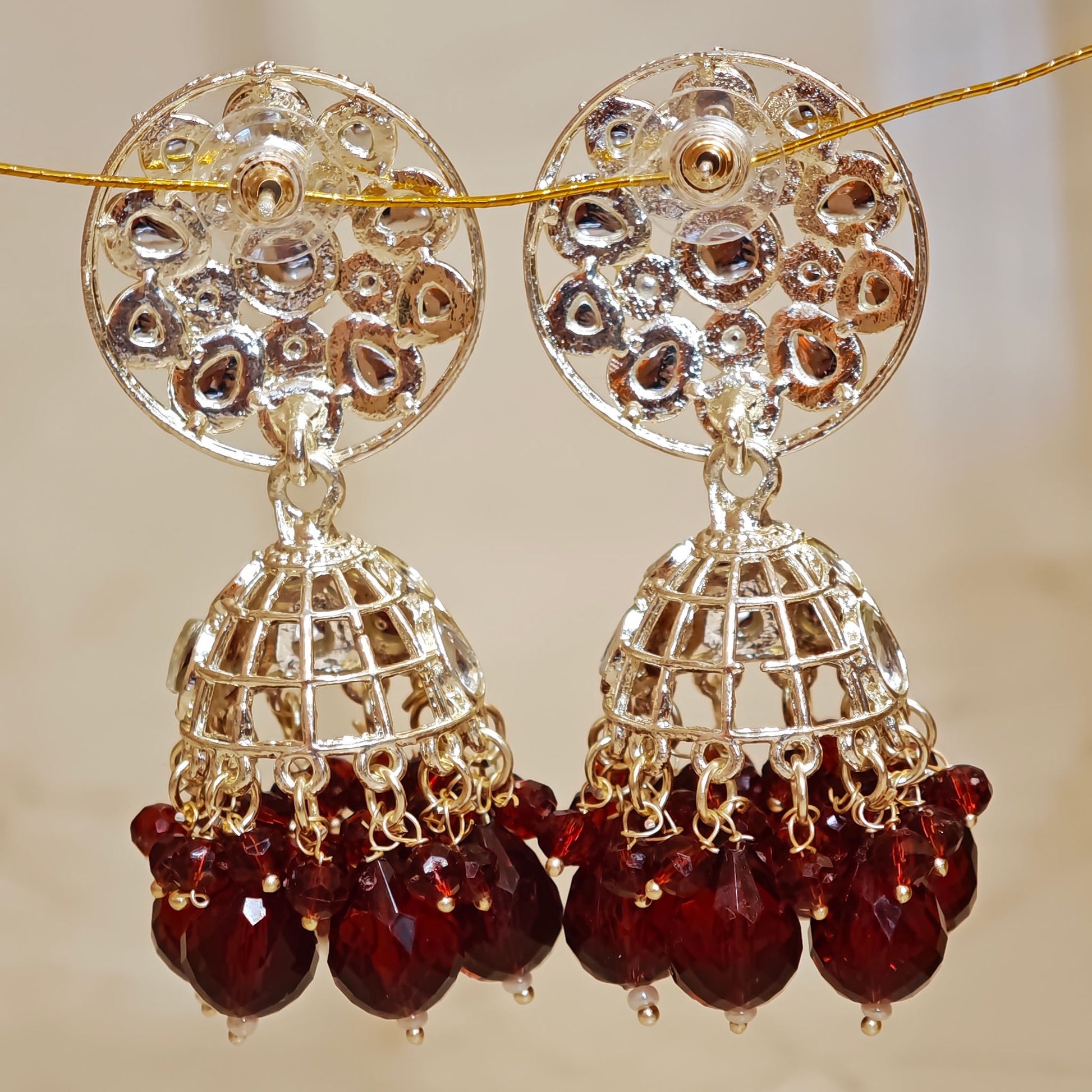 Elegant Red Kundan Jhumkis showcasing meticulously arranged polished gemstones with ornamental metalwork, presenting a sophisticated choice for those seeking distinctive traditional jewelry with contemporary appeal.